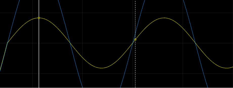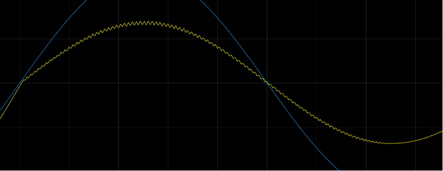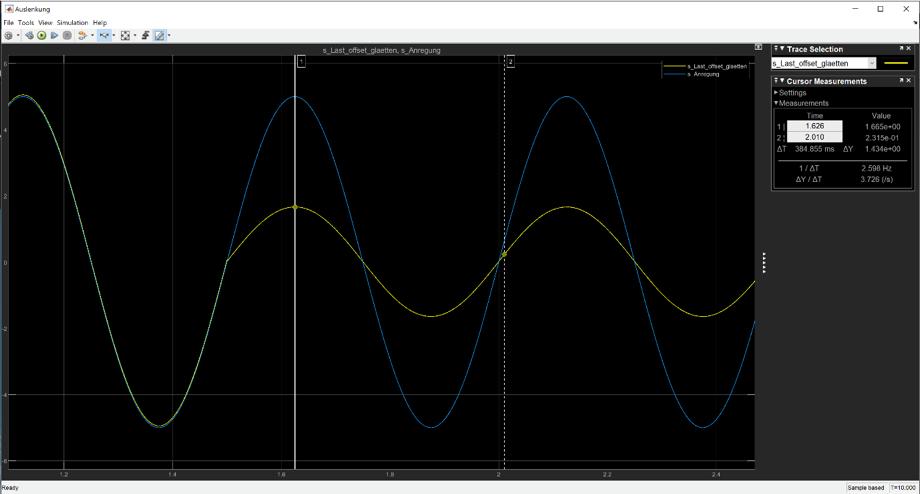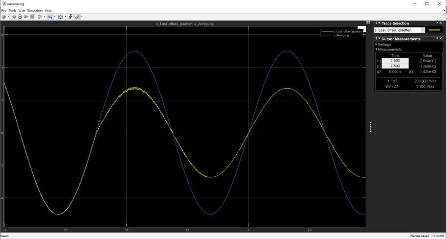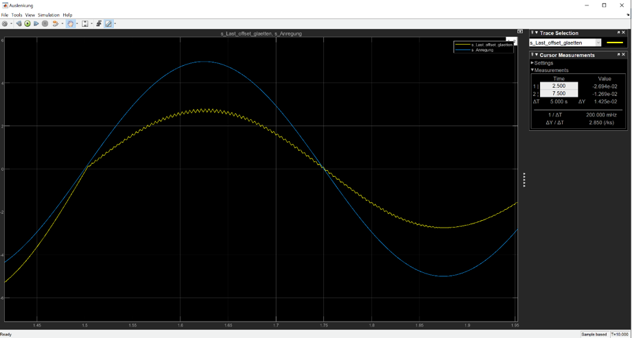 Damit die Regelung richtig funktionieren kann, sollte die Signalqualität ausreichend gut sein. Wie man auf folgender Abb. sieht ist blau der anregende Signalverlauf dargestellt. Dieser wird direkt in Simulink mittels Sinus-Generator erzeugt und ist ideal glatt.