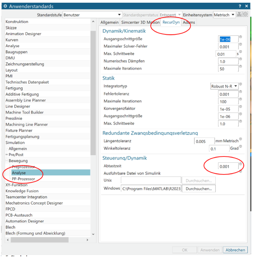 In NX-motion kann die Abtastzeit der Co-Simulation angegeben werden. Oben war diese mit Δt=0,001s (1ms) angegeben. Diese wird im weiteren auf Δt=0,0001s (0,1ms) verfeinert.