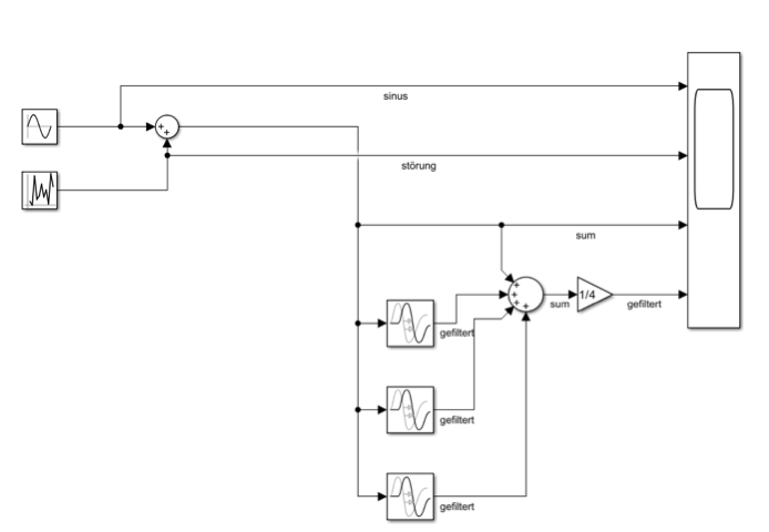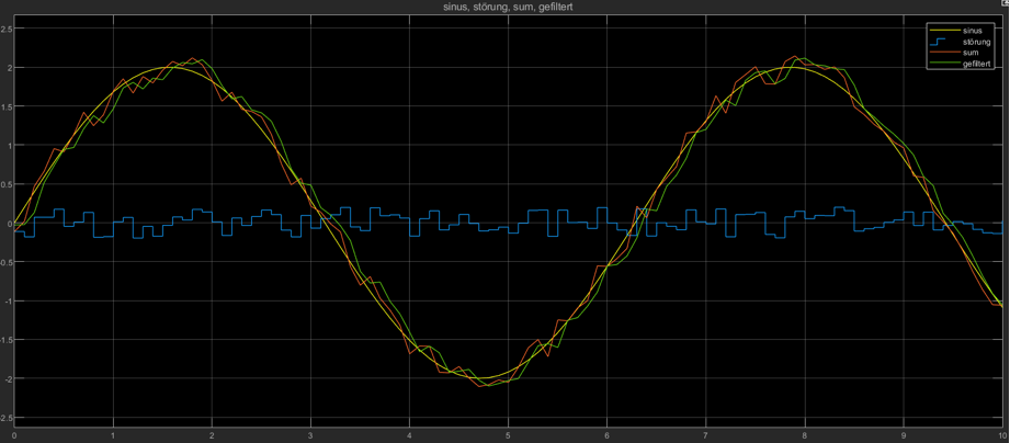 Hier sieht man gelb eine Sinuswelle. Die blaue Störung wird zum roten Signal überlagert. Das grüne Signal wird mittels 4 zeitlich nacheinander gemessenen Werten gemittelt.