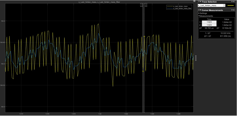 Gelb dargestellt sieht man eine aus NX-motion rückgeführte Messgröße … in diesem Fall ein Wegsignal in Z-Richtung. Man sieht deutlich ein überlagertes Rauschen mit einem Dreiecksverlauf. Dieses Rauschen stört die Funktion der im Zeitbereich operierende Signalblöcke wie den PID-Regler oder auch ein daraus erneut abgeleitetes Wegsignal für die Schwingungskompensation.